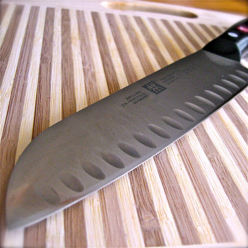 Speaking of blade maintenance, it is a good idea to keep your knife clean. If you place a damp rag next to your cutting board while you are working, you will be able to clean your blade immediately and not have to jackhammer minced garlic off of it later (which is good exercise and all...) Also, it is great to have a damp cloth handy to wipe down your board quickly between ingredients.