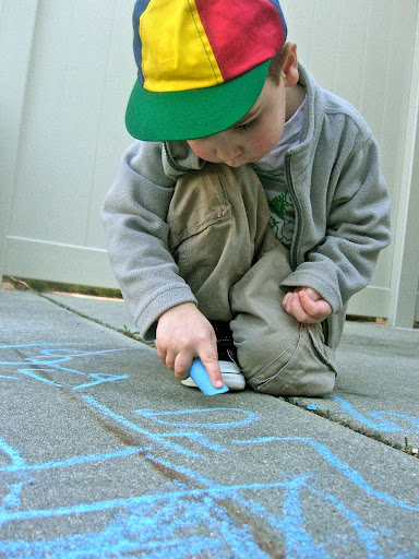 There is something about having a large canvas that makes this activity so much more fun than writing on a piece of paper inside. I love seeing Buddy's imagination and art skills blooming. Now he is drawing pictures for himself. Though, I miss his requests to draw