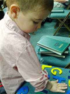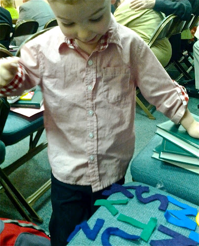 A little activity I put together has stood the test of time for keeping Buddy occupied. I cut out some felt letters using a few different colors of felt.  He becomes totally engrossed in laying out the letters (which stick great to the cushioned seats in our chapel).