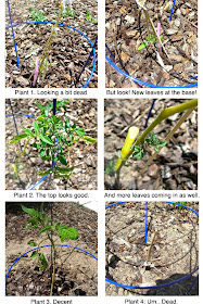A couple of weeks ago, my awesome sister gave me some tomato plants that she had started from seed. When I received them from her, it was a bit cold to put them in the ground, so I waited.....a bit too long.  By the time I was ready to put them in the ground, they were looking pretty shabby.  I hadn't taken very good care of them.  I went ahead and planted them anyway, though I had written off all but one of them.  After two weeks of care, here's the break down of my 4 tomato plants: