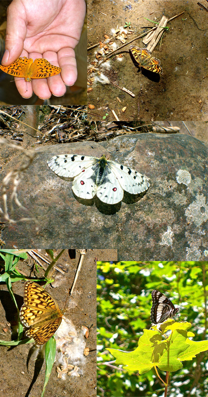 My best species guesstimation from Left to Right: Boloria chariclea, Field Crescent- Phyciodes pulchella, Clodius Parnassian, Mormon Fritillary, Weidemeyer’s Admiral Butterfly-Limenitis weidemeyerii |