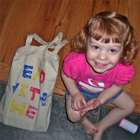 I purchased some sturdy canvas bags from Hobby Lobby and some fabric paints. I like the little Scribbles fabric paints. There's something about that magical 99 cent price tag. I didn't want to dish out the money for letter stamps, so I decided to create my own. I purchased a package of craft foam (in sheets) from the dollar store and layered it to give the stamps some depth. Then I glued on a layered foam square on each letter to use as a handle. They actually worked pretty well, especially for what they cost me. Just a tip, if you are stamping onto fabric, those foam sheets are great to have as a backing under the fabric to prevent bleed through.