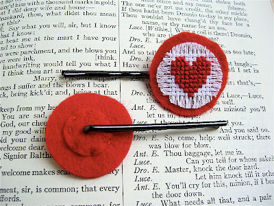 To mount the cross-stitch and felt to the bobby-pin, just cut out a smaller circle for the back and using your floss, stitch the two circles together. You'll need to slit the smaller circle so that it fits over the back-side of the bobby pin. That's it! How's that for a simple, little project for during nap time?