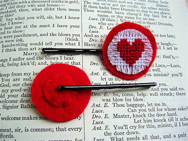 Creating a needlecraft bobby pin is really simple.  I don't have any how to pics, but I'll give a summary of the process. All you need is a set of bobby pins, felt, floss, hot glue and a small cross-stitch sample. You'll want to purchase bobby pins with glue pads.  You can generally find them at local craft stores. I found great deals on e-bay as well.