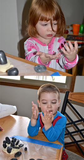 Then he squished all of the dough together and created a monster. When he was done with that he worked on hiding the rocks inside the dough. Weird how adding one new thing can change everything.
