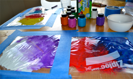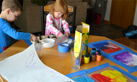 On one side of the table I set up some paint in ziplock bags. I've seen this activity done a ton on Pinterest. You just put some paint blobs in ziplock bags and tape them down. Buddy doesn't like getting his hands messy, so this was a good solution for clean play. Even still it took a little convincing because he dislikes paint so much. Of course, once we showed him how to draw letters in the paint, he was sold.