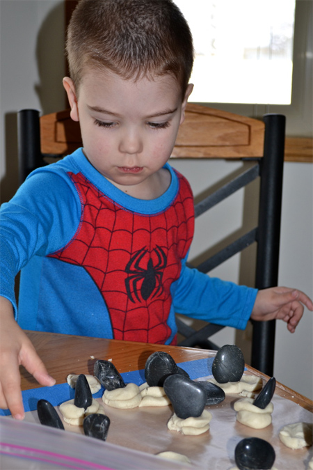 Then he squished all of the dough together and created a monster. When he was done with that he worked on hiding the rocks inside the dough. Weird how adding one new thing can change everything.