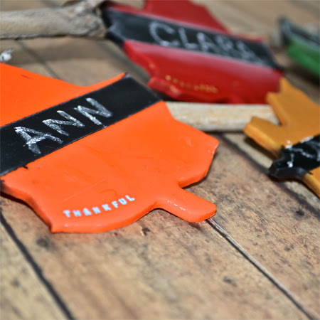 I just used the same process as I used with the ornaments and then spray painted a strip of chalkboard paint through the center. These are easily re-useable from year to year, plus, your guests can wipe off their names and write something they are thankful for on their leaf during dinner. I also thought that these could easily double as coasters.
