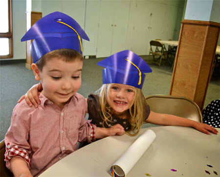 Graduation day was complete with awesome paper graduation hats. Here's Buddy being led in by his teacher.