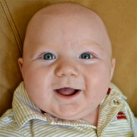 He loves his toes, fingers (any fingers), siblings that will entertain him and being sung to. He seems to be taking a shine to toy cars already and thinks peek-a-boo is a laugh out loud riot.
