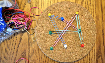 A few weeks ago, I saw a great picture of a push pin geo board using a cork board, push pins and rubber bands. I wish I had the link. It was such a simple idea, that I thought I'd give it a try with my kids.