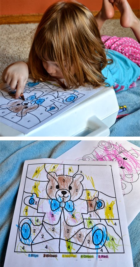 I decided that we should have some teddy bear related activities as well. The first was a color by number sheet. She is working on her number recognition right now, so it was perfect.