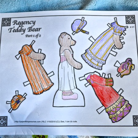 I spent a while the night before coloring this cute paper bear set. She didn't appreciate my effort, but I thought it was adorable. I cut it out for her and let her dress the bear.