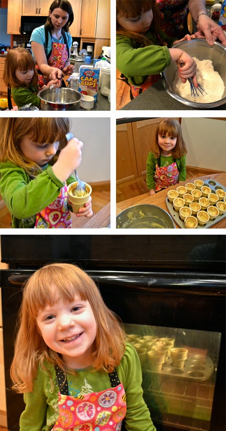 This little girl loves to bake, so we finally managed to find some time to get into the kitchen this past week. We made Cupcake Sundaes. Just choose any cupcake mix or recipe for homemade, pour it into some flat-bottomed ice-cream cones and bake. We just followed the recipe baking temperature and time.