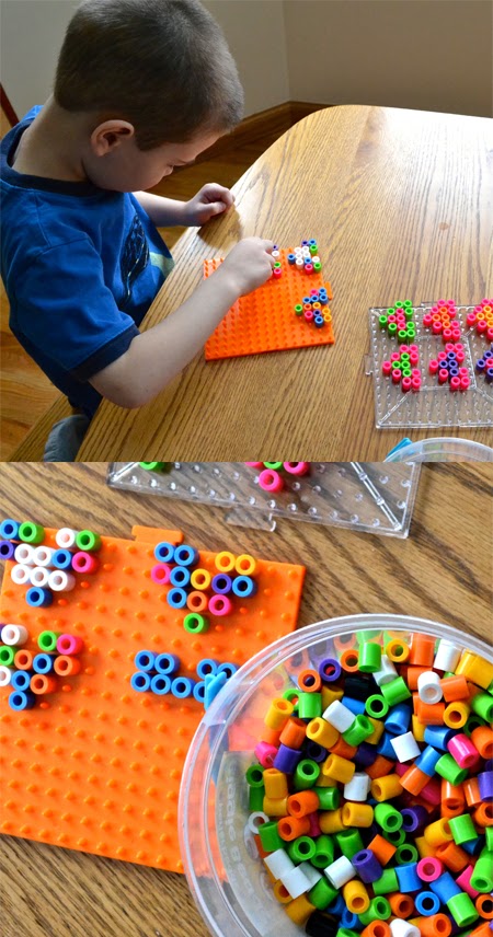 This year, for Valentine's, Buddy wanted to make something special for his classmates at school. So, we pulled out the perler beads and got to work. We've been playing with the larger beads. I think they are way easier for small fingers to work with.