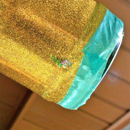 I filled a small-ish jar with warm water (almost to the very top) and then used two tubes of glitter glue (from the dollar store) to create the fairy dust. Then, after I shrunk my fairy, I put her in the jar too.